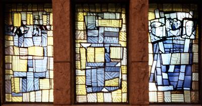 Freie Komposition mit den Porträts von ?. Charles Crodel, 1963 - 1965 Fenster im Altarraum, Antikglas/Blei/Schwarzlot |