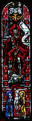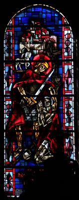 St. Martin von Tours teilt seinen Mantel mit dem Bettler. Jacques Le Chevallier, um 1955 Fenster im Seitenschiff, Antikglas/Blei/Schwarzlot |