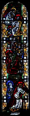 Wiederfindung des zwölfjährigen Jesus im Tempel. Künstler unbekannt, um 1900 Fenster im Seitenschiff, Antikglas/Blei/Schwarzlot/Silbergelb |