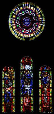 Maria und Johannes unter dem Kreuz, Christi Auferstehung. Jacques Le Chevallier, um 1950 Fenster im Chor, Antikglas/Blei/Schwarzlot |