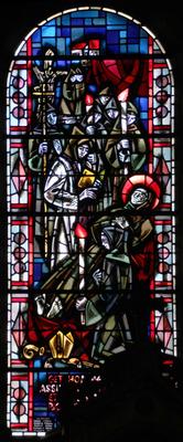 St. Jeanne D'Arc. / Die hl. Johanna von Orleans. Jacques Le Chevallier, um 1960 Fenstergruppe im Querschiff, Antikglas/Blei/Schwarzlot |