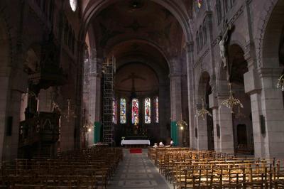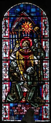Ein Feuerball fiel auf den Kopf des hl. Martin, während er die Messe las. Jacques Le Chevallier, um 1950 Fenster im Seitenschiff, Antikglas/Blei/Schwarzlot |