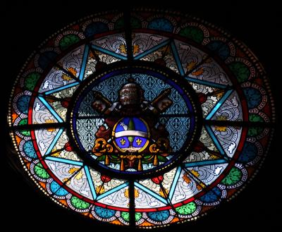 Ornament mit Wappen. Künstler unbekannt, um 1900 Fenster im Querschiff, Antikglas/Blei/Schwarzlot/Silbergelb |