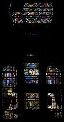 Verkündigung an Maria, Christi Geburt, die Heilige Familie. Jacques Le Chevallier, um 1950 Fenster im Chor, Antikglas/Blei/Schwarzlot |