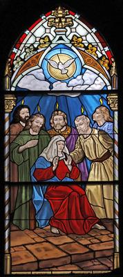 Geistsendung. Mariusz Wlodarczyk, 2005 Fenster im Schiff, Antikglas/Blei/Schwarzlot/Silbergelb Stifterinschrift: Gestiftet von den Nachkommen der Marie von Schmeling 2005 |