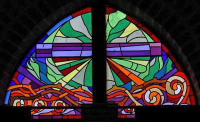 Kreuz, Dornenkrone, Wellen. Andrzej Ciesielski, 1982 Fenster über dem Seiteneingang, Antikglas/Blei |
