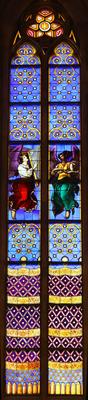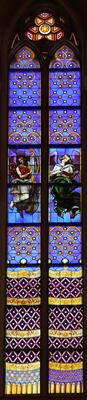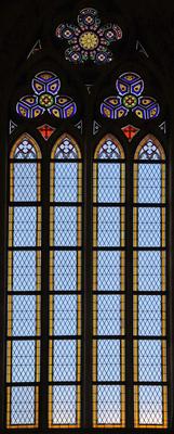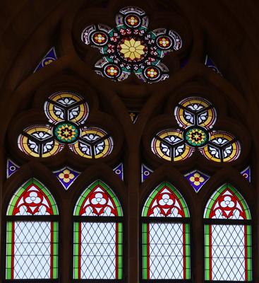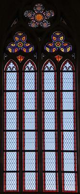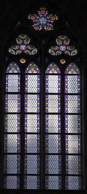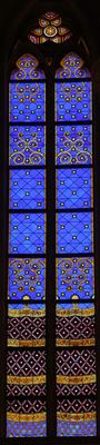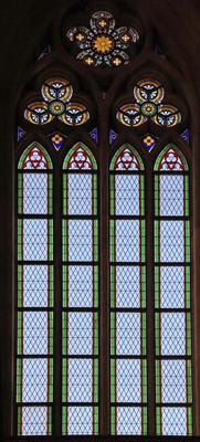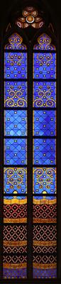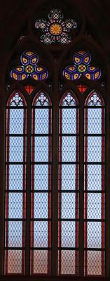 Ornament (Rekonstruktion auf Grundlage der Schinkel'schen Entwurfszeichnungen und eines wiedergefundenen ornamentalen Fensterdetails). Karl Friedrich Schinkel, 1829 Fenster im Chor, Antikglas/Blei |
