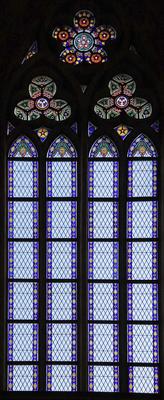 Rautenmuster mit stilisiertem floralen Maßwerk-Ornament (Rekonstruktion auf der Grundlage der Schinkel'schen Entwurfszeichnungen). Karl Friedrich Schinkel, 1829 Fensterspitze im Schiff, Antikglas/Blei/Schwarzlot |