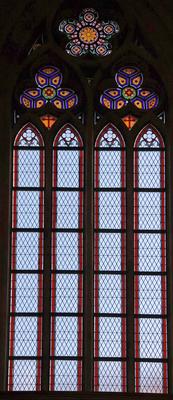 Ornament (Rekonstruktion auf Grundlage der Schinkel'schen Entwurfszeichnungen und eines wiedergefundenen ornamentalen Fensterdetails). Karl Friedrich Schinkel, um 1830 Fenster im Chor, Antikglas/Blei |