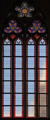 Rautenmuster mit stilisiertem floralen Maßwerk-Ornament (Rekonstruktion auf der Grundlage der Schinkel'schen Entwurfszeichnungen). Karl Friedrich Schinkel, 1829 Fenster im Schiff, Antikglas/Blei/Schwarzlot |