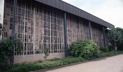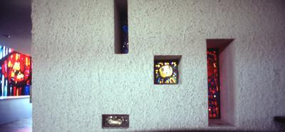 Lobgesang der Männer im Feuerofen (Daniel 3,51-90). Die Herrlichkeit der Werke Gottes auf Erden werden in verschiedenen Streifen symbolisiert als Blitze, Feuer und Glut (gelb und rot), Ströme und Meer (blau), die Erde (grün und braun), Wind und Wolken, Licht und Dunkelheit. Die Erde als zentrales Motiv wird symbolisiert als Früchte des Altarsakraments: Ähren und Trauben. Rudolf Hägele, 1961 seitliche Fensterwand, Betonglas |