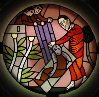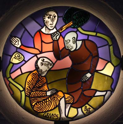 Jesus heilt einen Gelähmten. Hans-Joachim Burgert, 2004 Rundfenster vor einer elektrischen Lampe, Opalglas/Blei/Schwarzlot |
