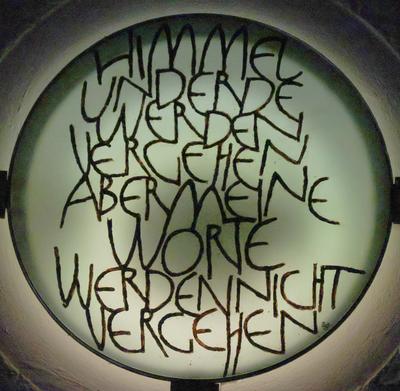 Himmel und Erde werden vergehen. Aber meine Worte werden nicht vergehen. Hans-Joachim Burgert, 2004 Rundfenster vor einer elektrischen Lampe, Opalglas/Schwarzlot Signatur: JHB |