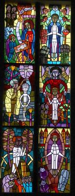 Szenen aus dem Leben Jesu: Christi Geburt, Taufe Jesu im Jordan, Getsemani, Christi Auferstehung, Christi Himmelfahrt, Gericht. Hans-Joachim Burgert, 1957 - 1958 Fenster im Chor, Antikglas/Blei/Schwarzlot Signatur: AUSFÜHRUNG WERKSTÄTTEN AUGUST WAGNER 1958 |