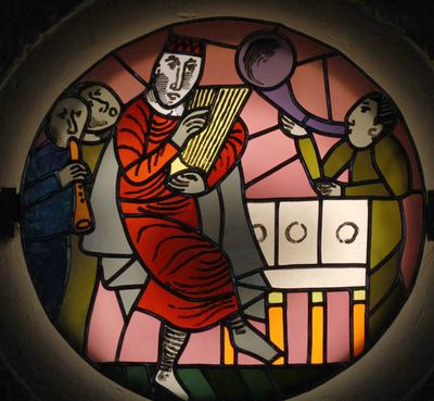 König David mit Harfe. Hans-Joachim Burgert, 2004 Rundfenster vor einer elektrischen Lampe, Opalglas/Blei/Schwarzlot |