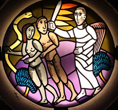 Vertreibung aus dem Paradies. Hans-Joachim Burgert, 2004 Rundfenster vor einer elektrischen Lampe, Opalglas/Blei/Schwarzlot |
