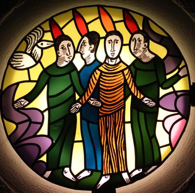 Ausgießung des Heiligen Geistes / Pfingsten. Hans-Joachim Burgert, 2004 Rundfenster vor einer elektrischen Lampe, Opalglas/Blei/Schwarzlot |