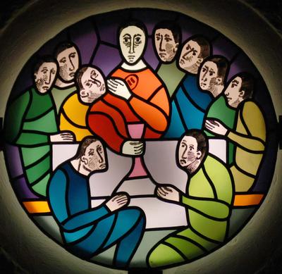 Abendmahl. Hans-Joachim Burgert, 2004 Rundfenster vor einer elektrischen Lampe, Opalglas/Blei/Schwarzlot |