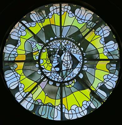 Die Apokalyptische Frau (Offb 12,1-6). Wilhelm Buschulte, 1955 Rosette auf der Orgelempore, Antik-,Opal-,Strukturglas/Blei |