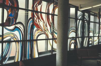 Freie Komposition. (Diese Glasmalerei wurde 2014 beim Umbau des Gebäudes zerstört.) Bernd Rosenheim, 1980 - 1981 ehem. Fenster im Warteraum Erdgeschoss, Antik-,Opalglas/Blei |