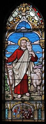 Christus der gute Hirte. Künstler unbekannt, um 1904 Fenster im Chor, Antikglas/Blei/Schwarzlot/Silbergelb |