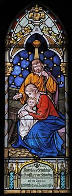 Christi Geburt. Künstler unbekannt, 1904 Fenster im Chor, Antikglas/Blei/Schwarzlot/Silbergelb Stifterinschrift: Zum 80sten Geburtstage der Frau Marie von Schmeling geb. von Gaudecker gewidmet d 25sten Dezember 1904 |