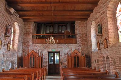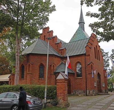 Kreuz, Dornenkrone, Wellen. Andrzej Ciesielski, 1982 Fenster über dem Seiteneingang, Antikglas/Blei |
