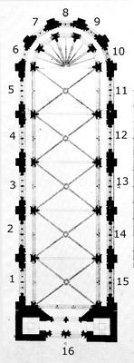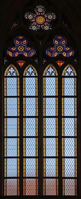 Ornament (Rekonstruktion auf Grundlage der Schinkel'schen Entwurfszeichnungen und eines wiedergefundenen ornamentalen Fensterdetails). Karl Friedrich Schinkel, 1829 Fenster im Chor, Antikglas/Blei |