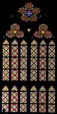 Rautenmuster mit stilisiertem floralen Maßwerk-Ornament (Rekonstruktion auf der Grundlage der Schinkel'schen Entwurfszeichnungen). Karl Friedrich Schinkel, 1829 Fensterspitze im Schiff, Antikglas/Blei/Schwarzlot |