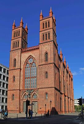 Rautenmuster mit stilisiertem floralen Maßwerk-Ornament. Die Fenster wurden bei der Instandsetzung der Kirche 1985/86 auf der Grundlage der Schinkel'schen Entwurfszeichnungen, die 1829 von Ludwig Ferdinand Hesse angefertigt wurden, rekonstruiert und in der Glaswerkstätte Schölzel, Berlin, hergestellt. Karl Friedrich Schinkel, 1829 Fenster im Schiff, Antikglas/Blei/Schwarzlot |