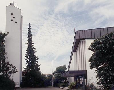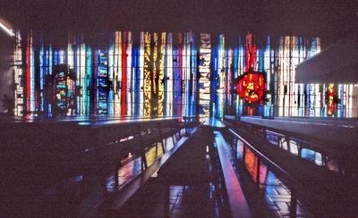 Lobgesang der Männer im Feuerofen (Daniel 3,51-90). Die Herrlichkeit der Werke Gottes auf Erden werden in verschiedenen Streifen symbolisiert als Blitze, Feuer und Glut (gelb und rot), Ströme und Meer (blau), die Erde (grün und braun), Wind und Wolken, Licht und Dunkelheit. Die Erde als zentrales Motiv wird symbolisiert als Früchte des Altarsakraments: Ähren und Trauben. Rudolf Hägele, 1961 seitliche Fensterwand, Betonglas |