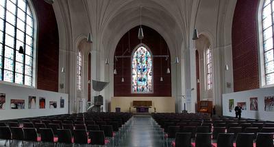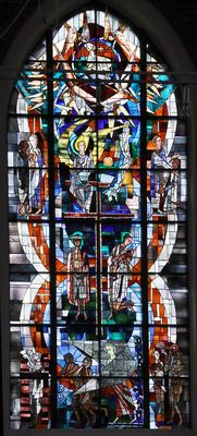 Szenen aus dem Alten und Neuen Testament: Sündenfall, Vertreibung aus dem Paradies, Turmbau zu Babel. / Der dornengekrönte Christus, Heilung eines Blinden. / Christi Auferstehung, der ungläubige Thomas, Sendungsauftrag an Petrus. / Das Lamm im Himmlischen Jerusalem. Hans Gottfried von Stockhausen, 1960 Fenster im Altarraum, Antikglas/Blei/Schwarzlot |