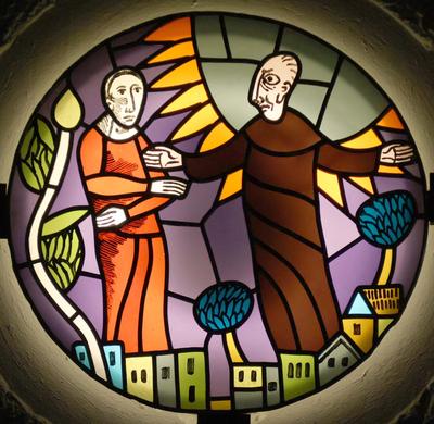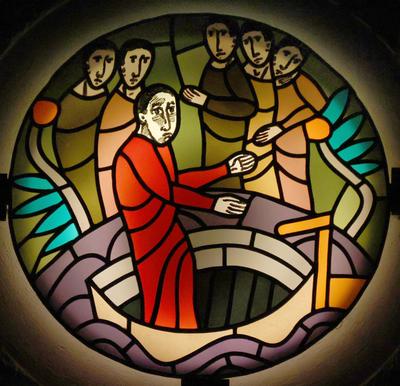 Jesus predigt vom Wasser aus. Hans-Joachim Burgert, 2004 Rundfenster vor einer elektrischen Lampe, Opalglas/Blei/Schwarzlot |