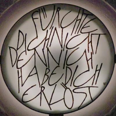 Fürchte dich nicht, denn ich habe dich erlöst. Hans-Joachim Burgert, 2004 Rundfenster vor einer elektrischen Lampe, Opalglas/Schwarzlot Signatur: JHB |