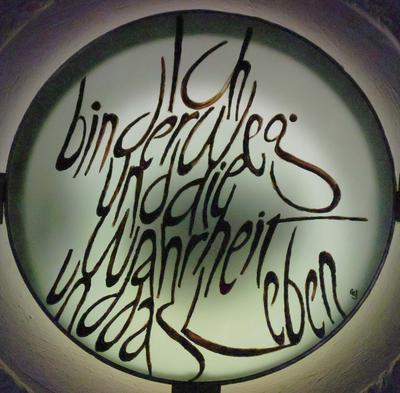 Himmel und Erde werden vergehen. Aber meine Worte werden nicht vergehen. Hans-Joachim Burgert, 2004 Rundfenster vor einer elektrischen Lampe, Opalglas/Schwarzlot Signatur: JHB |