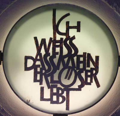 Ich weiss, dass mein Erlöser lebt. Hans-Joachim Burgert, 2004 Rundfenster vor einer elektrischen Lampe, Opalglas/Schwarzlot Signatur: JHB |