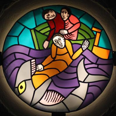Jona und der Walfisch. Hans-Joachim Burgert, 2004 Rundfenster vor einer elektrischen Lampe, Opalglas/Blei/Schwarzlot |