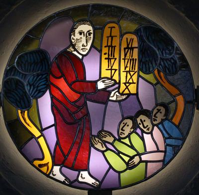 Mose mit den Gesetzestafeln. Hans-Joachim Burgert, 2004 Rundfenster vor einer elektrischen Lampe, Opalglas/Blei/Schwarzlot |
