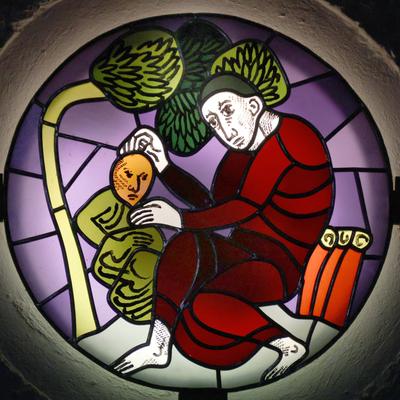 Jesus heilt einen Gelähmten. Hans-Joachim Burgert, 2004 Rundfenster vor einer elektrischen Lampe, Opalglas/Blei/Schwarzlot |