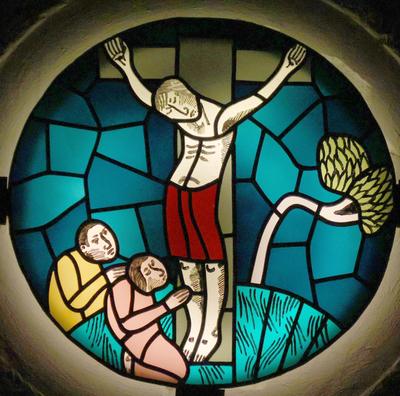 Maria und Johannes unter dem Kreuz. Hans-Joachim Burgert, 2004 Rundfenster vor einer elektrischen Lampe, Opalglas/Blei/Schwarzlot |