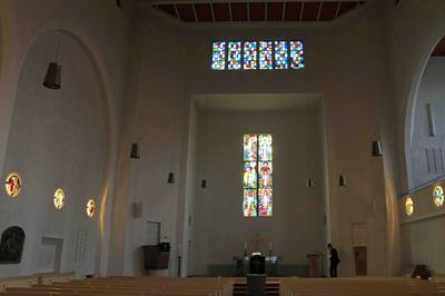 Szenen aus dem Leben Jesu: Christi Geburt, Taufe Jesu im Jordan, Getsemani, Christi Auferstehung, Christi Himmelfahrt, Gericht. Hans-Joachim Burgert, 1957 - 1958 Fenster im Chor, Antikglas/Blei/Schwarzlot Signatur: AUSFÜHRUNG WERKSTÄTTEN AUGUST WAGNER 1958 |