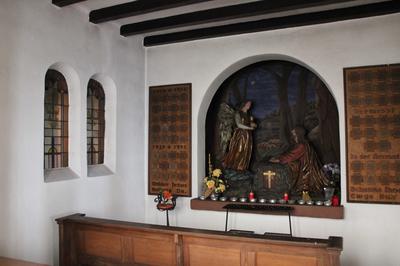Leidenswerkzeuge, Symbole der Passion. Hermann Michels, um 1950 Fenster in der Halle, Kathedralglas/Blei/Schwarzlot/Silbergelb |